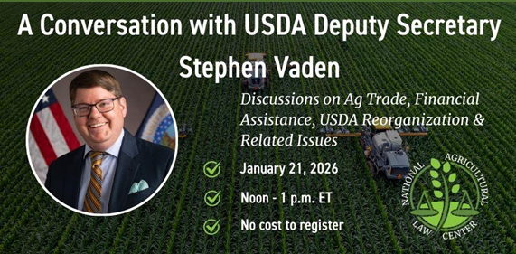 - Webinar Opportunity (January 21, 2026): Judge Stephen Vaden, USDA Deputy Secretary, will present an update on ag trade, financial assistance, USDA reorganization, and related issues. To register, click here.